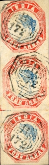 PHILATELIC ITEMS Title: 1854: Singapore Post Office: 4as Red/Blue Vertical Strip of 3 Cancelled with B-172 Date: 04-Oct-1854 Cover Type: |
