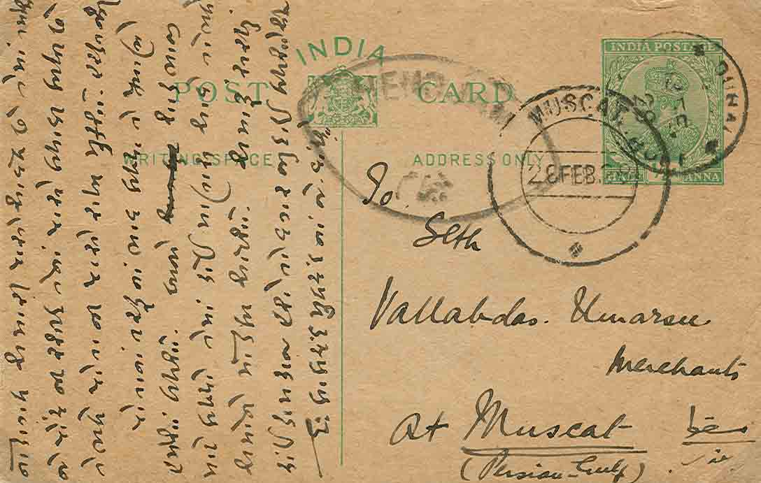1928 Incoming Postcard sent from Dubai to Muscat