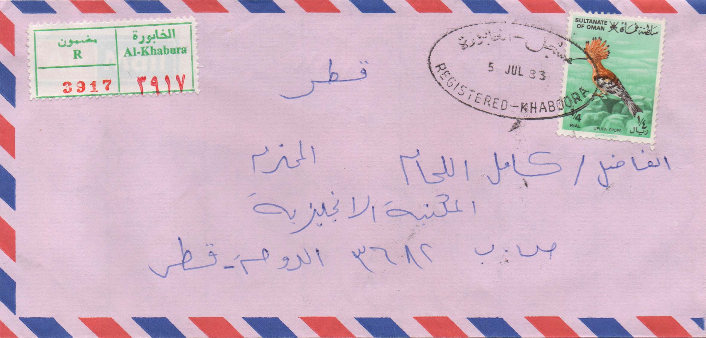 1983 Registered Mail from Khaboora to Qatar