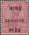 In 1921 the “NINE PIES on 1a” King George V Surcharge was issued as a service stamp. The stamp was issued in response to the new Imperial Inland postage rate of 9 pies which covered the rate for a letter weighing up to 1 tola.